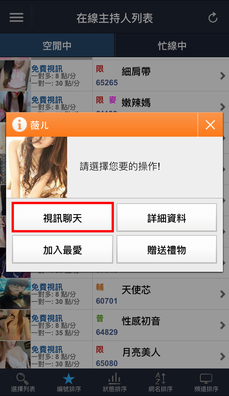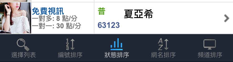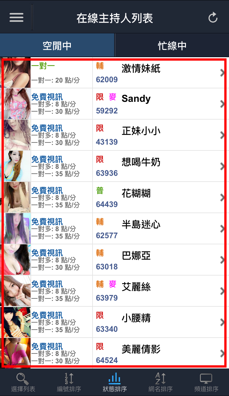 5. 頻道排序:依主持人目前所開立的頻道排序,例如免費視訊、免費聊天、一對一視訊、一對多視訊等...。