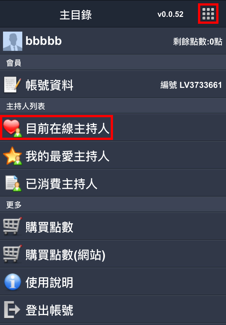 1. 選擇列表:可選擇主持人列表( 我的最愛、己消費主持人、所有主持人)